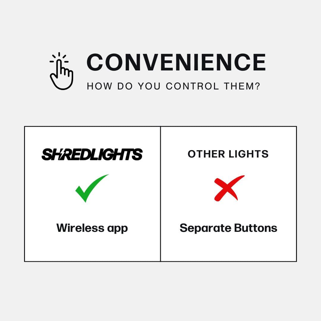 - Full Wireless Control: Adjust brightness, sync multiple lights, and customize settings with the ShredLights app.