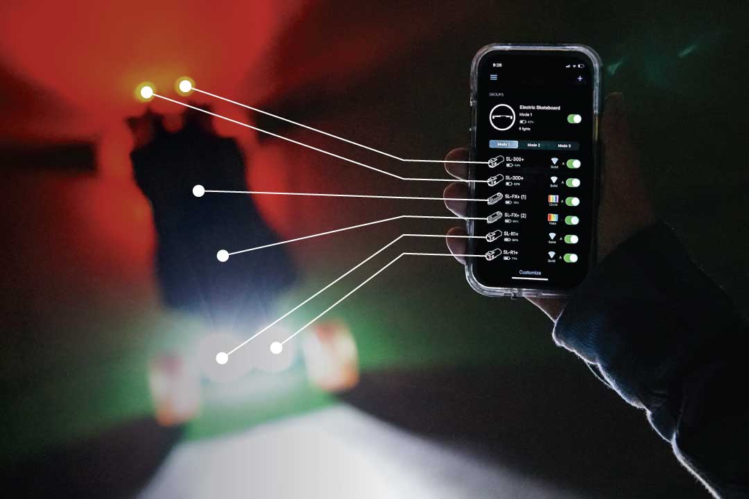 Pair up to 12 lights to the ShredLights app. Customize light modes and control groups with a single touch.