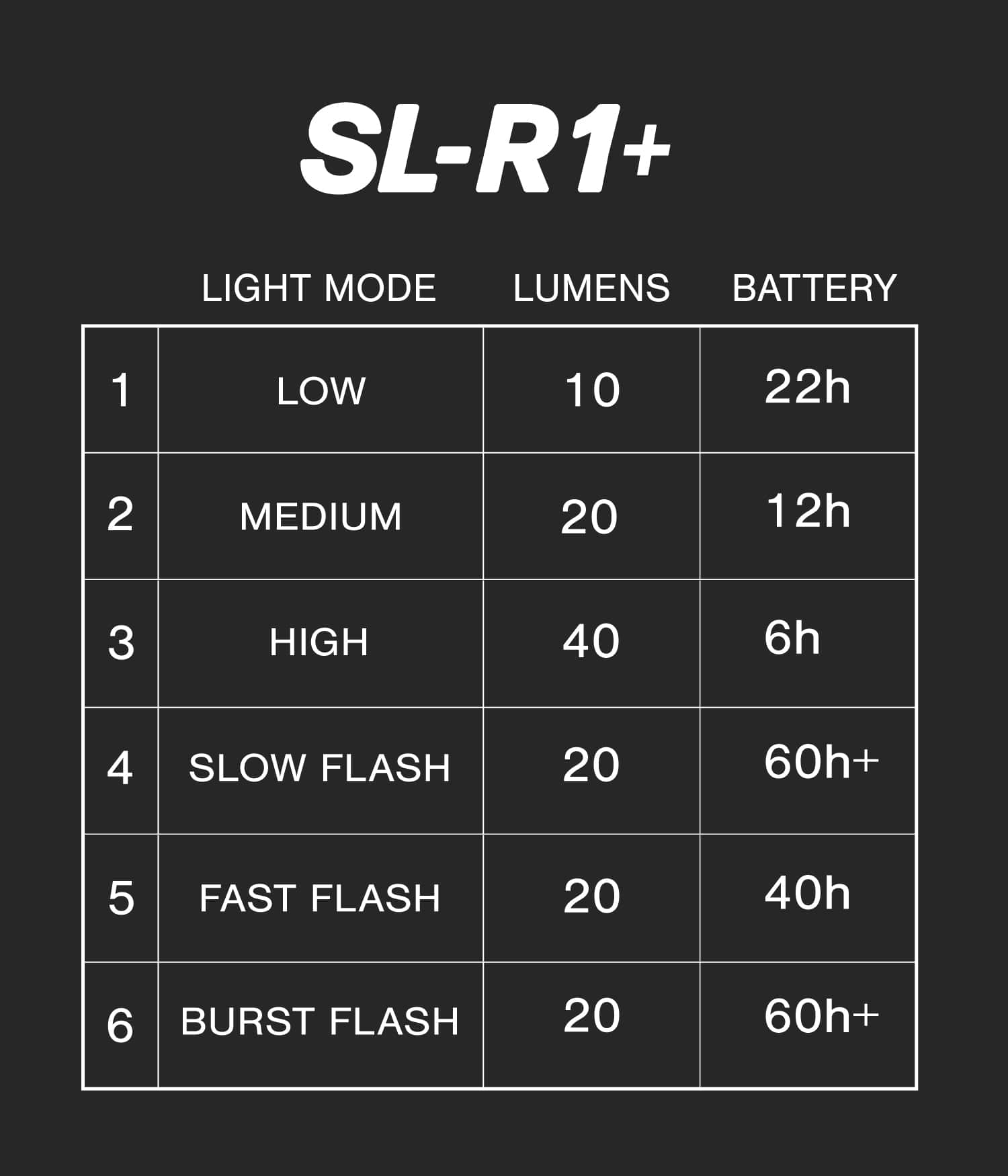 The SL-R1+ must be parallel to the ground with the lens pointing opposite to the direction of movement (backwards) in order to detect the correct braking direction. When you slow down rapidly, the SL-R1+ changes from the current light mode to solid mode at full brightness for 2 seconds (or longer depending on how fast you are moving) then returns to the current light mode.